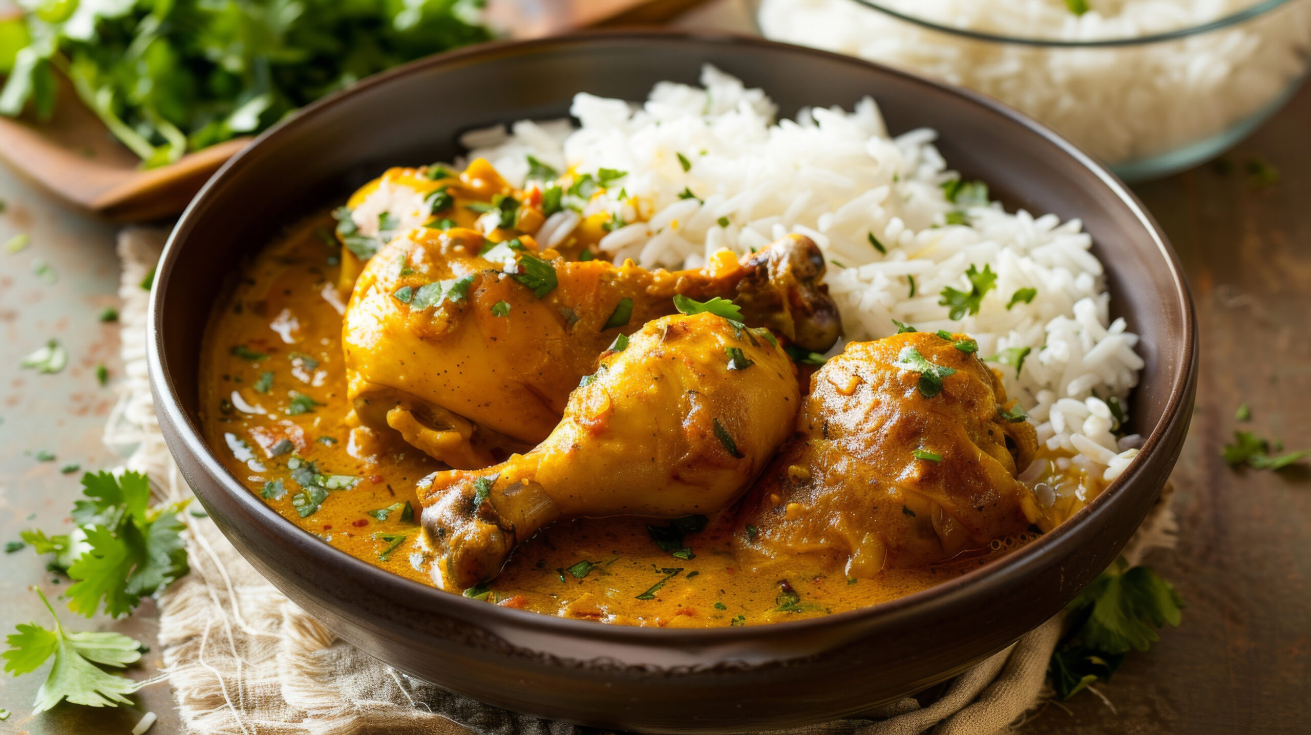 - Mariner le poulet avec l’huile d’olive, 1 c. à s. de d’ail semoule, 2 c. à s. de colombo, et la moitié de l’oignon.